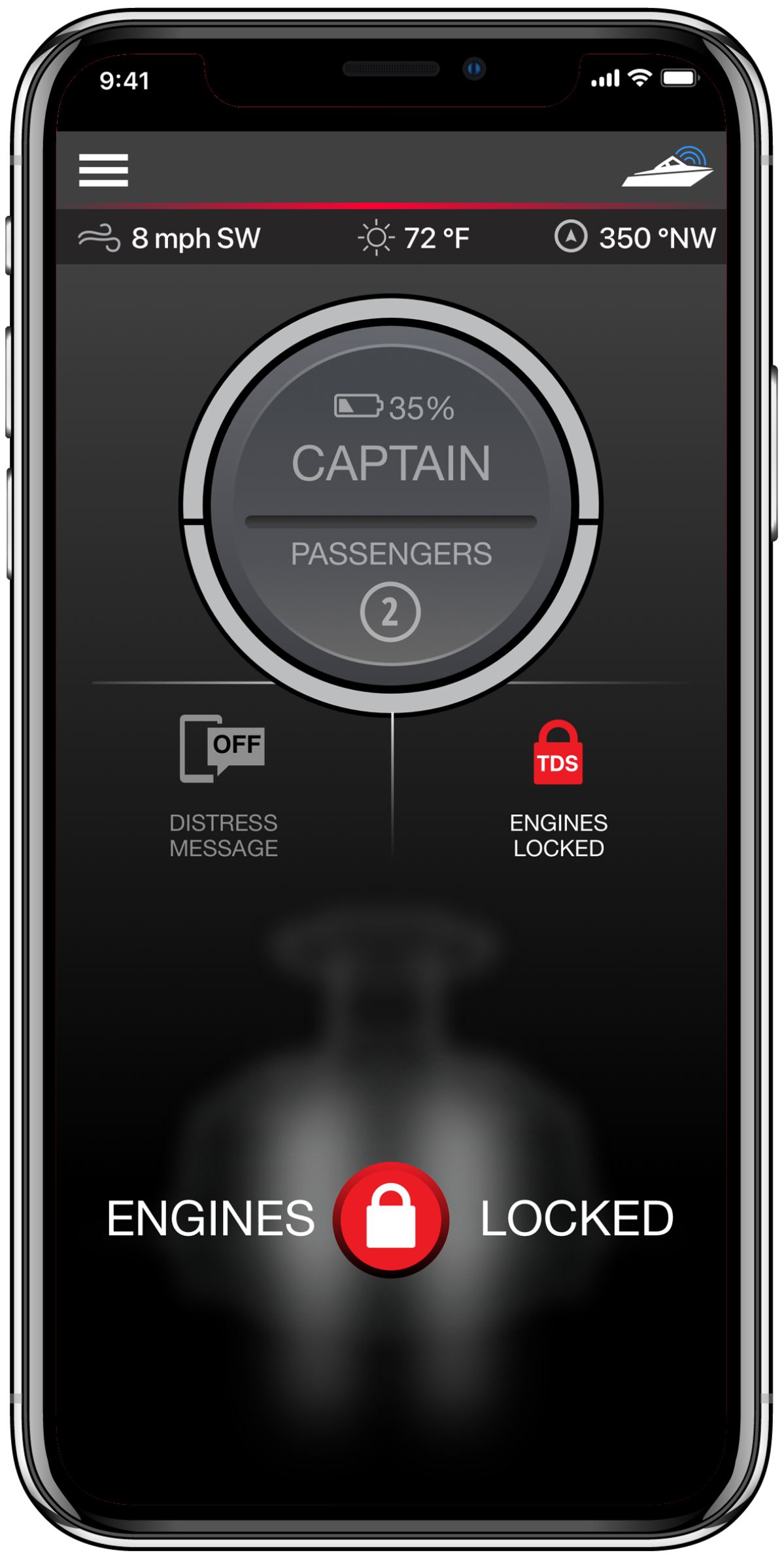 Ved hjælp af armbånd og FOB´s sørger 1st Mate for at motoren afbrydes og der sendes besked til alle hvis kaptajnen eller en af passagererne falder overbord. Vi Appen får du besked om nøjagtig GPS position og instruktioner til at genstarte motoren og vende tilbage til stedet hvor personen faldt i vandet.