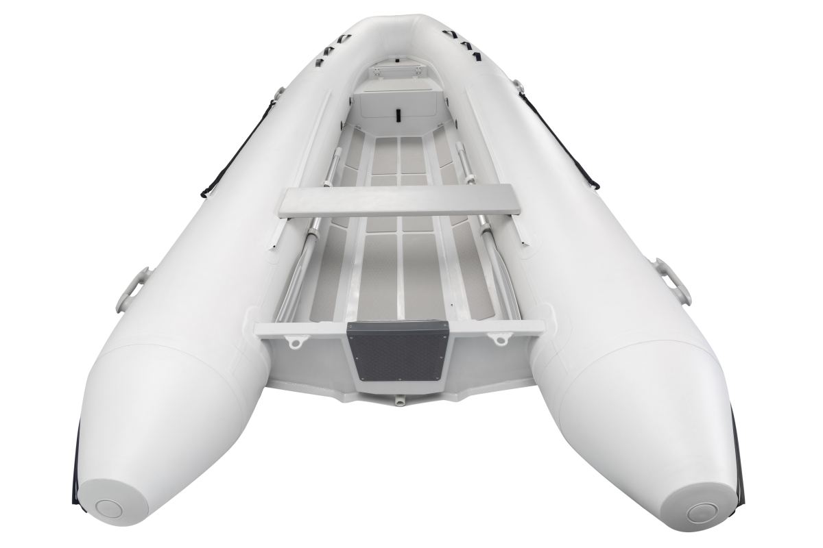 Robust og velsejlende alu-RIB gummibåd. Dobbelt V-skrog med fladt gulv. Styrepult fås som ekstraudstyr.